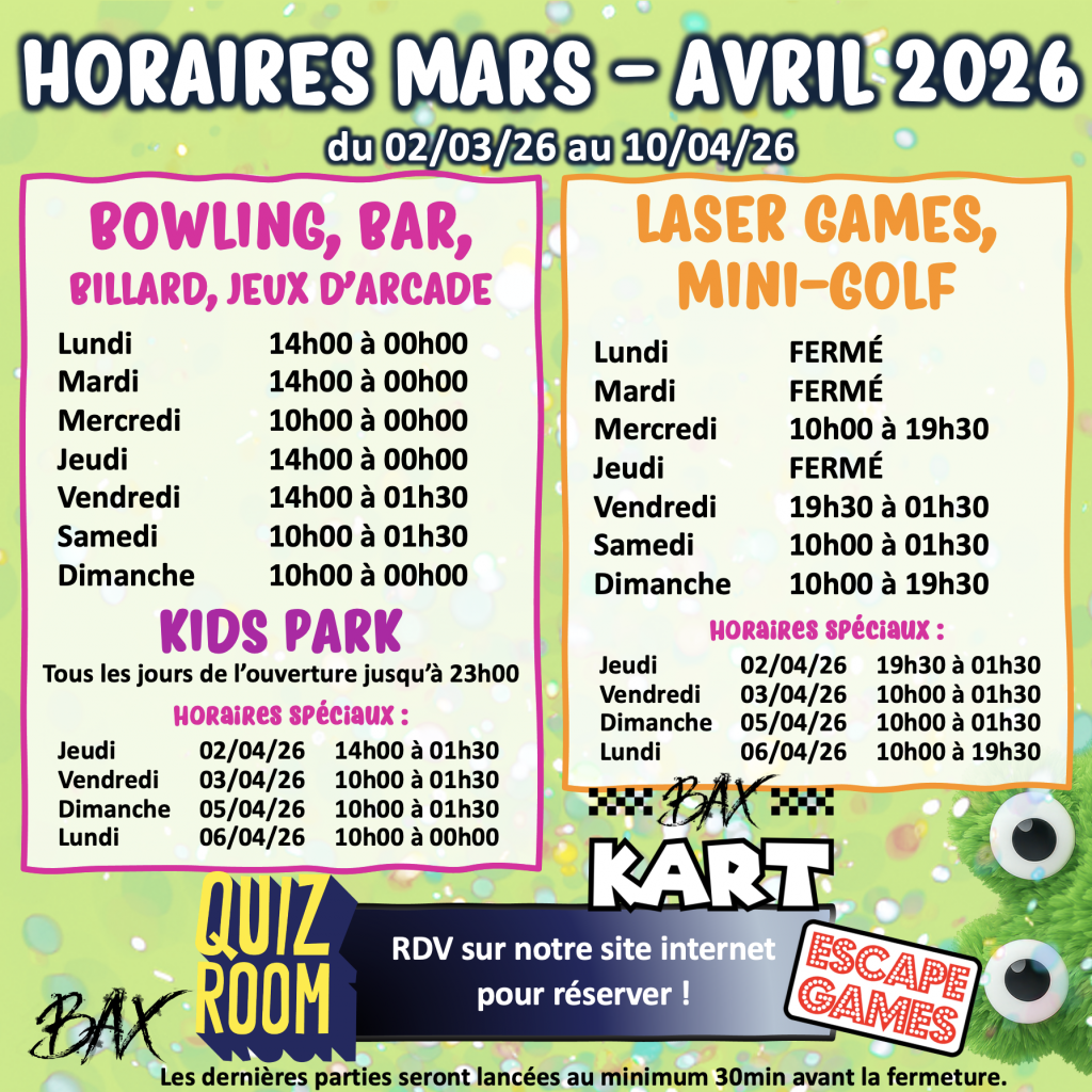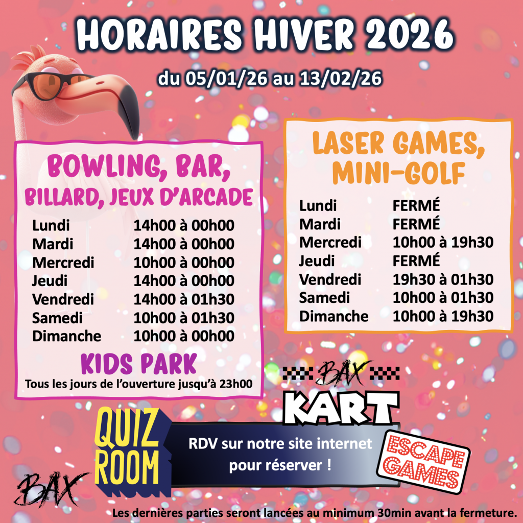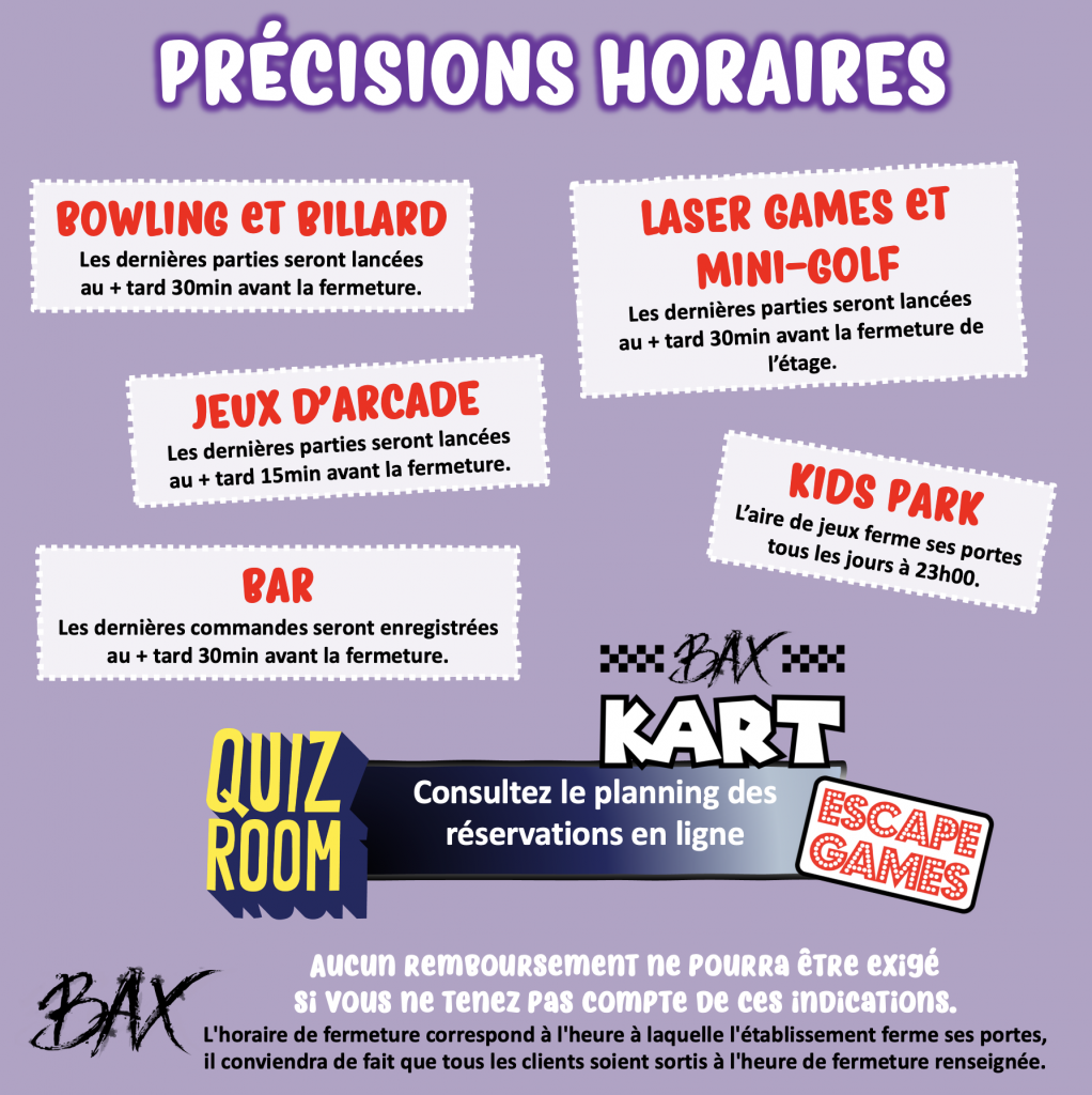 Dernières parties : environ 30 minutes avant la fermeture.